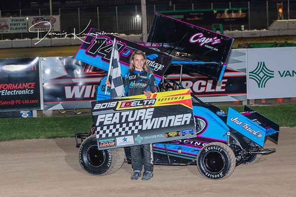 CLOVIS, CALIFORNIA (March 18, 2019) – 12 year-old Jade Avedisian earned her first career Delta Speedway Restricted Micro Sprint victory on Sunday evening, grabbing the win in her #14J Driven Chassis. Avedisian’s win came during the “WoO Weekend Special”, a non-points race that opens California’s Micro season and pays tribute to the World of Outlaws…