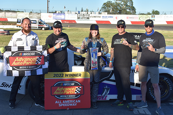 LOOMIS, CALIFORNIA (July 12, 2022) – 16-year-old Kenna Mitchell of Loomis, Calif. became the first female winner at All American Speedway under the NASCAR Pro Late Model banner, winning Saturday’s first 35-lap feature for the Berco Redwood Late Models in Roseville, Calif. Mitchell’s victory was paired with a runner-up finish in the second 35-lap event, placing the 2019 Bandolero track champion and 2021 Jr. Late Model track champion squarely into the 2022 Pro Late Model title fight. Photo by Don Thompson